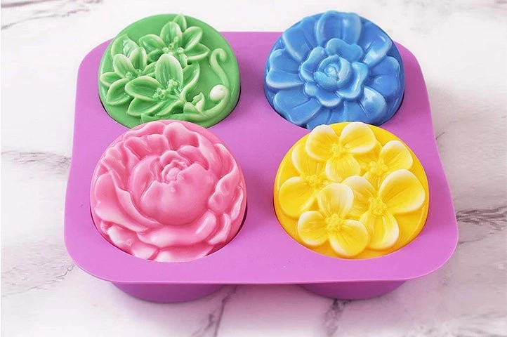Molde de silicona para hacer 4 jabones redondos con relieve de flores